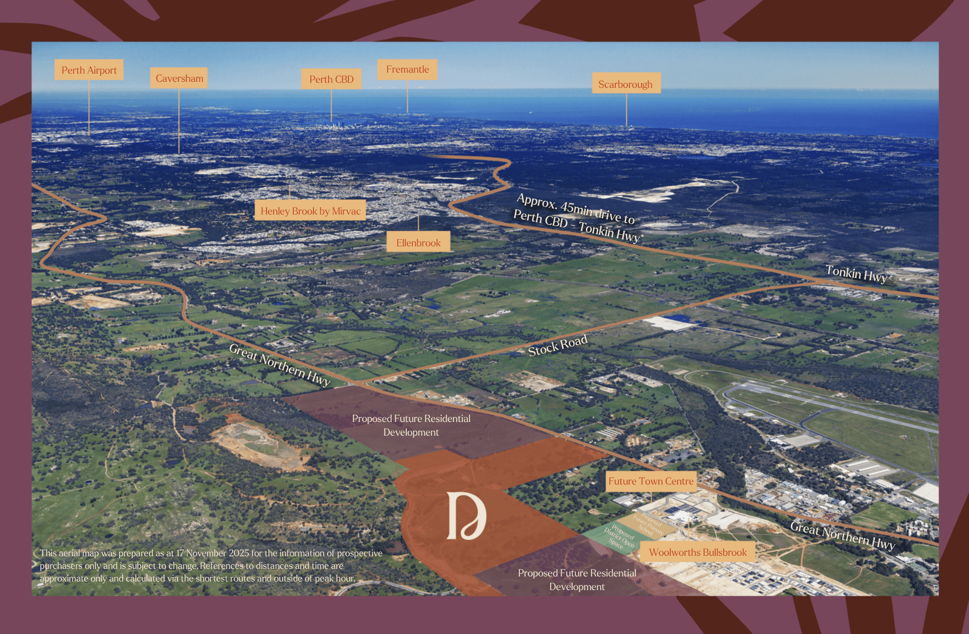 Located approximately 34km* north-east of Perth CBD, Bullsbrook offers easy access to the CBD via Tonkin Highway, enabling residents to commute seamlessly from home.